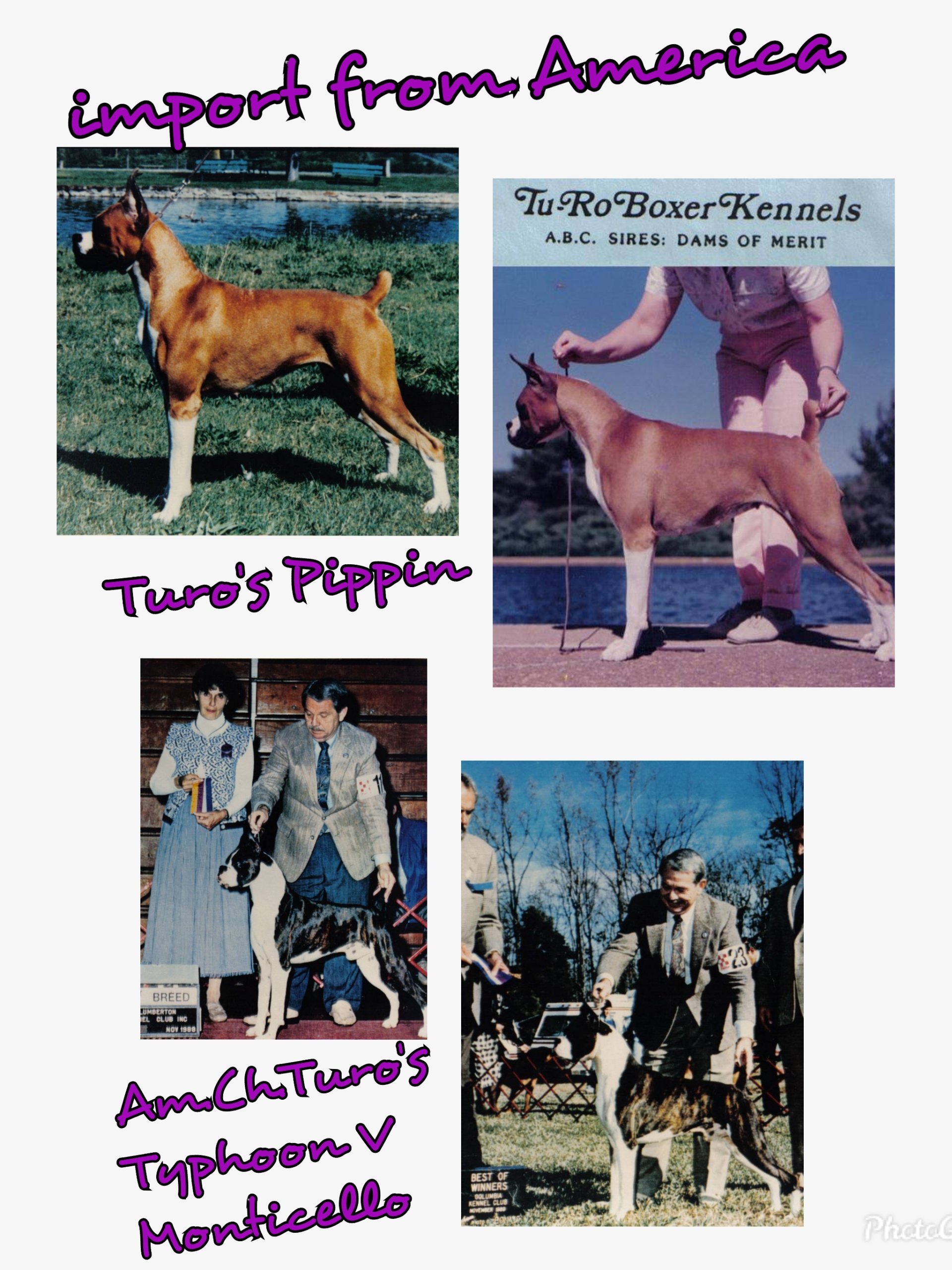 ...มาปี 2534 เราได้ติดต่อโดยตรงกับคอกที่มีชื่อเสียงที่สุดในสุนัขพันธุ์บ๊อกเซอร์ที่ประเทศอเมริกา และเราก็ได้แชมป์เปี้ยนอเมริกาปี 1990 CH.Turo's Typhoon V Monticello "ไต้ฝุ่น" กับแม่พันธุ์เป็นลูก Ch.Turo's Empire สายเลือดดีเยี่ยมของคอกทูโร่ มาประจำที่คอกสายรุ้ง ประเทศไทย
